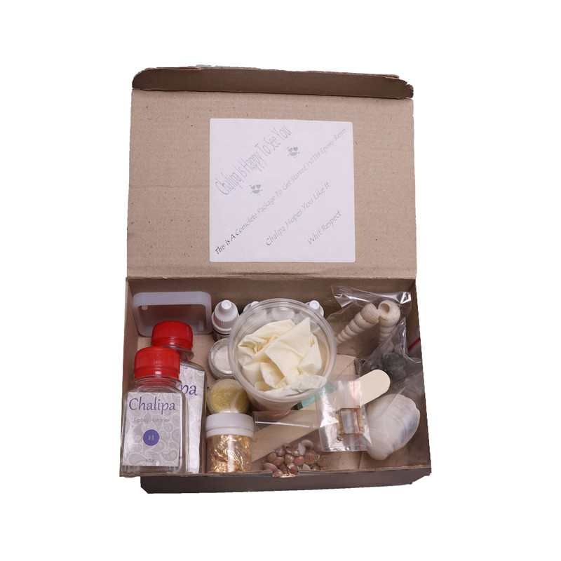 چلیپا باکس پکیچی کامل از تمامی موارد مورد نیاز یک هنرمند برای شروع کار با رزین اپوکسی است که شامل رزین اپوکسی،هاردنر اپوکسی،قالب سیلیکونی،قاب برنجی،شش بسته رنگ پودری،4 بسته رنگ جوهری،ورق طلای خرد شده،4نوع صدف،یک جفت دستکش لاتکس،لیوان یک بار مصرف،چوب بستنی میباشد