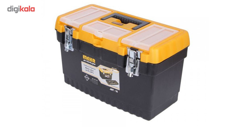 با این جعبه ابزار دیگر نگران گم شدن ابزارآلات خود نمی شوید و تمامی آن ها را میتوانید در این جعبه به خوبی جایگذاری ، نگهداری و حمل کنید .امروزه با تنوع ابزارآلات بیشمار نیاز به یک جعبه ابزار کامل و با کیفیت بیش از پیش احساس میشود و جعبه ابزارهای مهر با ابعادهای گوناگون و طراحی های مختلف نیاز شما را به خوبی برطرف خواهند کرد .جعبه ابزار مهر مدل JMT-16 توسط شرکت مهر Mehr که یک شرکت کاملا ایرانی است ، طراحی و تولید میشود و جعبه ابزاری با کیفیت و قیمت مناسب می باشد.این محصول ، تولید شده از پلاستیک فشرده ، محکم و نشکن می باشد .قسمت داخلی این جعبهابزار شامل 5 محفظه است. سینی پلاستیکی مجزایی که در بالای محفظهی اصلی قرار دارد، برای ابزارهای بلندی همچون انواع آچار و انبر مناسب است. علاوهبر مخزن اصلی این کیف ابزار، سه محفظهی کوچک و درپوش پلاستیکی روی درب جعبه، فضای مناسبی را در اختیار کاربر قرار میدهند. دو قفل فلزی در طرفین، استحکام بالایی به این جعبهابزار بخشیدهاند و دستهی تاشویی برای حمل راحتتر آن در قسمت بالایی تعبیه شده است.مجهز به دو قفل فلزی مقاوم و همچنین دارای طراحی ارگونومیک و منحصر به فرد ، از دیگر ویژگی های خوب این محصول به شمار میروند .جعبه ابزار مهر ، دارای یک سینی با قسمت های مجزا و دو محفظه روی درب است ، که برای پیچ و مهره و خورده ریز طراحی شده است.رنگ بدنه آن مشکی و رنگ درب نارنجی است و همچنین دسته قابلیت تاشدن روی درب را خواهد داشت .