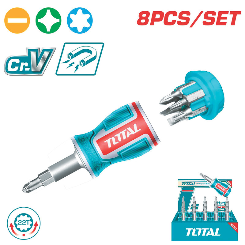 ست پیچ گوشتی مشتی توتال 8 عدد بیت : دوسو ، چهارسو و ستاره ای دسته ارگونومیک و ضدلغزش برند توتال تحت لیسانس آمریکا استاندارد CE اروپا