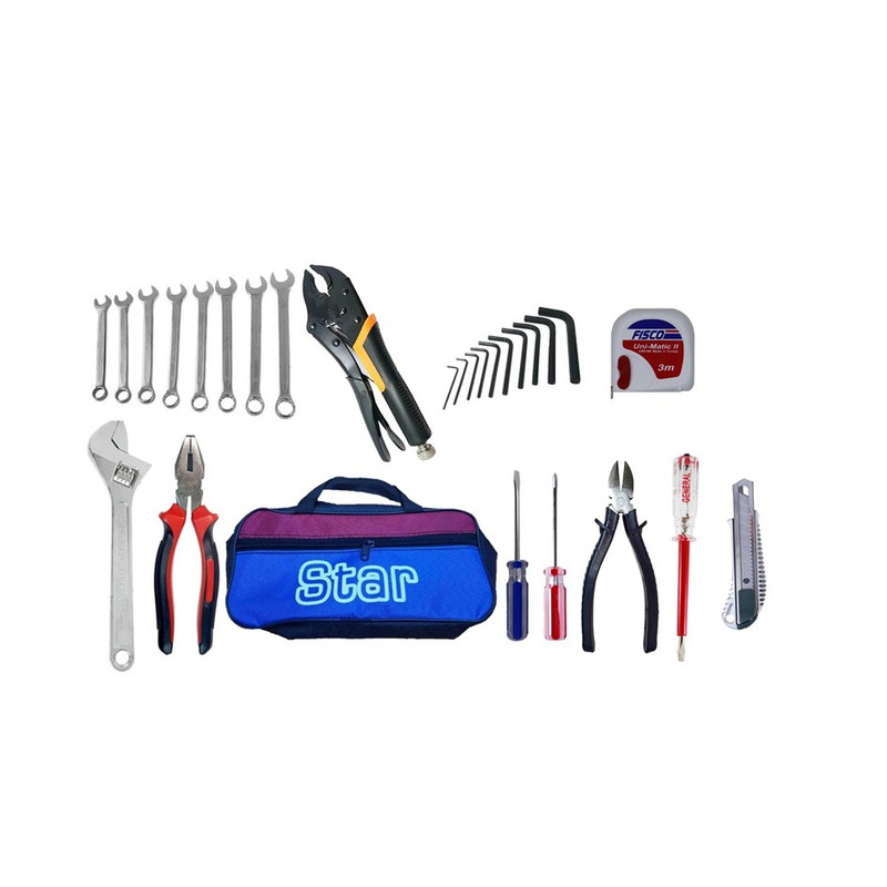 محتویات مجموعه: آچار آلن , آچار فرانسه , آچار یکسر تخت یکسر رینگی , انبر سیمچین , انبر قفلی , انبردست , پیچ گوشتی , فازمتر , کاتر , کیف ابزار , متر