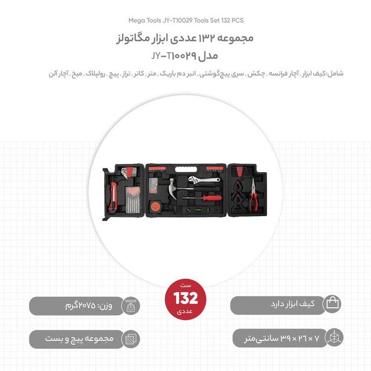 محتویات مجموعه: کیف ابزار , آچار فرانسه , چکش , سری پیچگوشتی , انبر دم باریک , متر , کاتر , تراز , پیچ , رولپلاک , میخ , آچار آلن