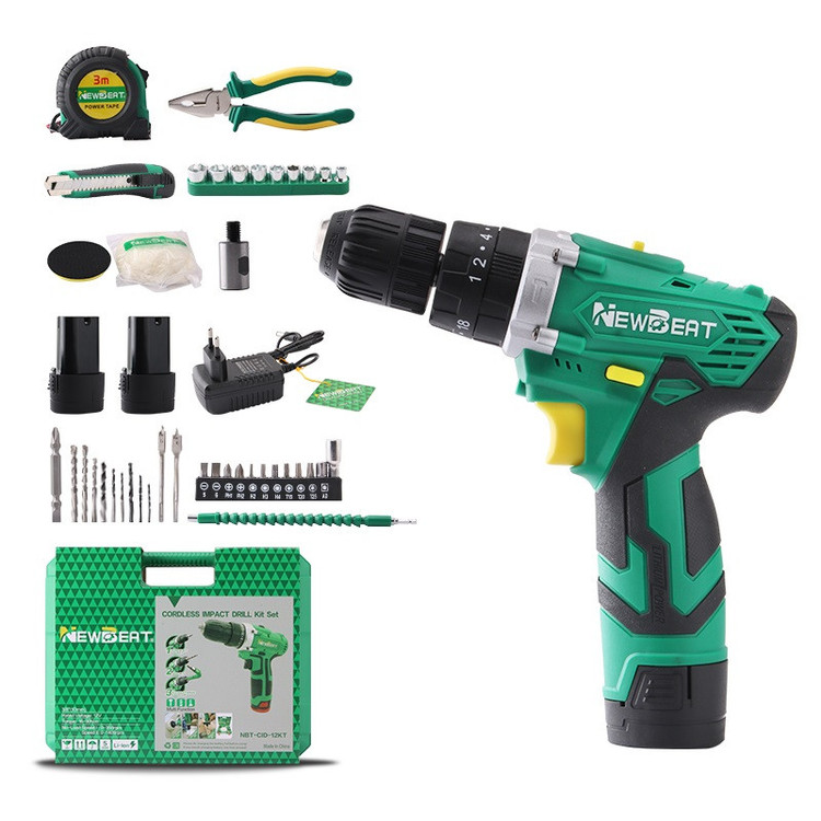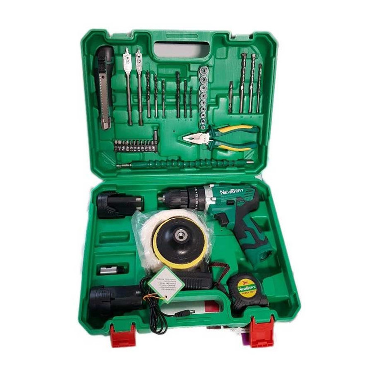 دریل پیچ بند چکشی شارژی نیوبیت با 2 باطری به همراه 43 عدد لوازم شامل رابط پیچ گوشتی خرطومی به طول 25 سانتی متر، پولیش و پد پولش ، نوک سایز های مختلف چهارسو ، دو سو ، ستاره ای و ... ، 9 عدد مته آهن و دیوار و دو سایز مته برگی ، 9 عدد بکس سایز های مختلف ، انبردست با کیفیت عالی ، متر 3 متری با کیفیت ، کاتر ، دو عدد باتری ، شارژر ، دفترچه راهنما می باشد لازم به ذکر است ظرفیت باتری 1500 میلی آمپر ساعت (mAh) و ولتاژ باتری 12 ولت و سایز سه نظام دستگاه 10 میلی متر و اتوماتیک بوده و حداکثر ظرفیت دریل کاری در آهن: 10 میلی متر و در چوب: 22 میلی متر می باشد.این دستگاه دارای حداکثر گشتاور 30 نیوتن متر و دارای کلید چپ گرد و راست گرد است. همچنین دستگاه دارای لامپ LED و کیف BMC می باشد.