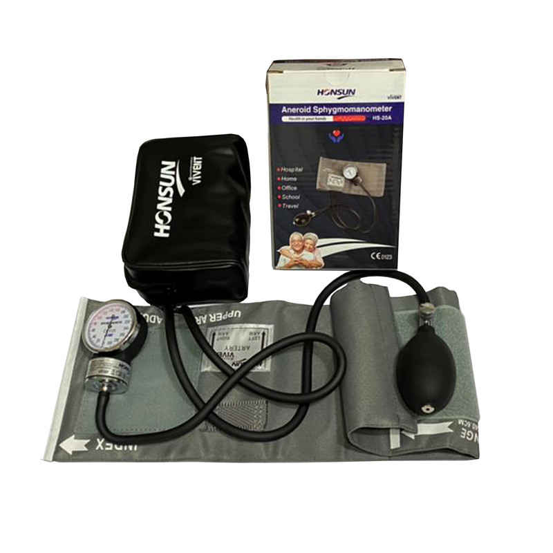 دارای گوشی دو پاویونه بدون نیاز به برق و باتری صفحه نمایش گرد ساعتی مانومتر با زمینه سفید و نوشته های مشکی و قرمز درشت