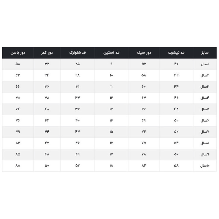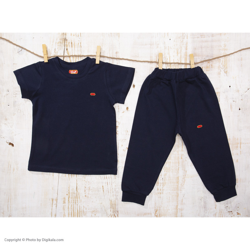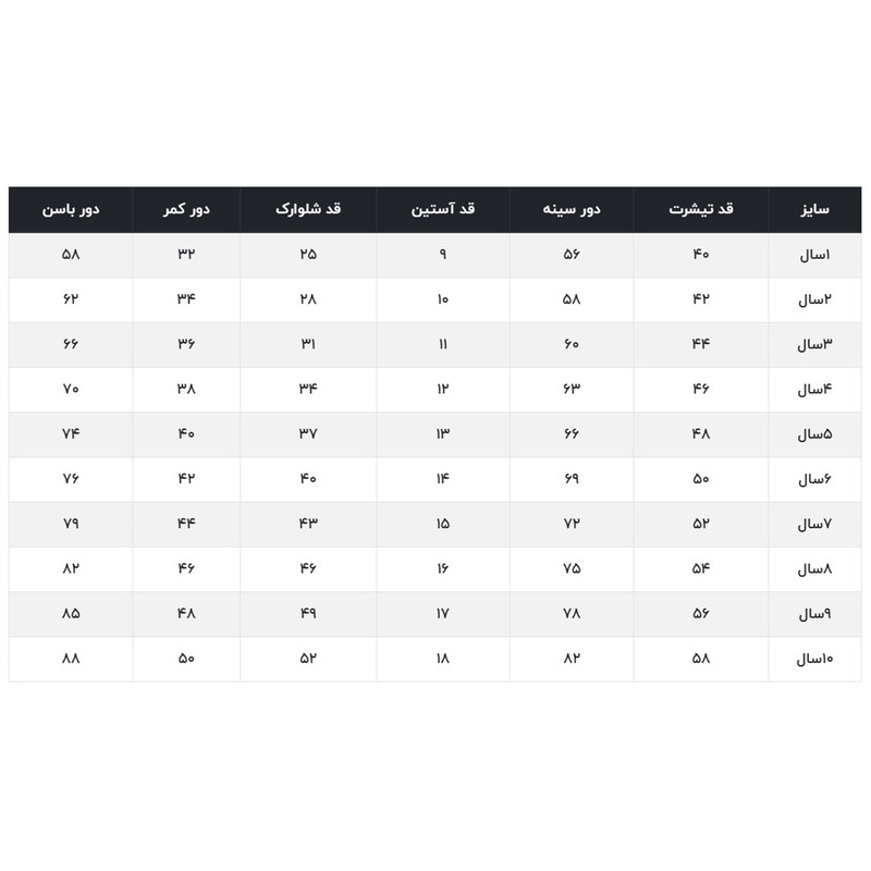 - ست تی شرت و شلوار پسرانه - دارای آستین کوتاه - فرم معمولی - مناسب برای استفاده روزمره - ابعاد لباس برای سایز 5: قد لباس برابر با 43 سانتیمتر عرض سینه برابر با 32 سانتیمتر - قد شلوار برابر یا 46 سانتی متر