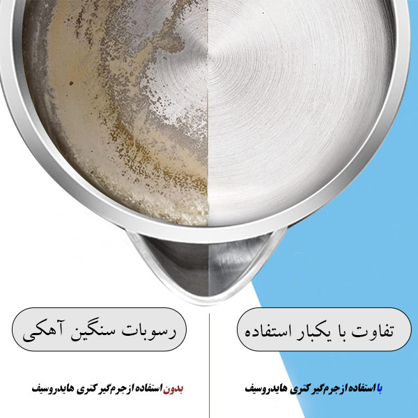 سایر توضیحات: - پس از استفاده از هایدروسیف در دستگاه چای ساز و سماور شما هیچ بویی باقی نمیگذارد - از بین بردن رسوبات قدیمی آهکی بسیار موثر است - مهندسی معکوس از معتبر ترین برند های بین المللی - باعث افزایش طول عمر دستگاه شما - فرمولاسیون جدید