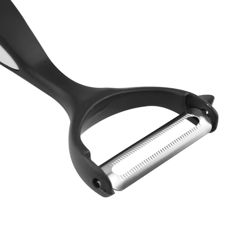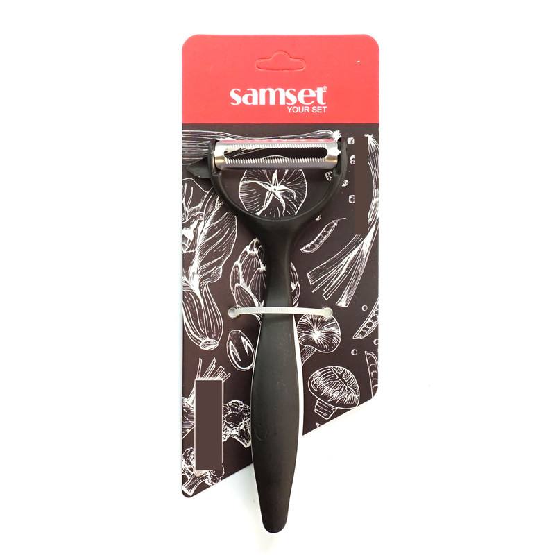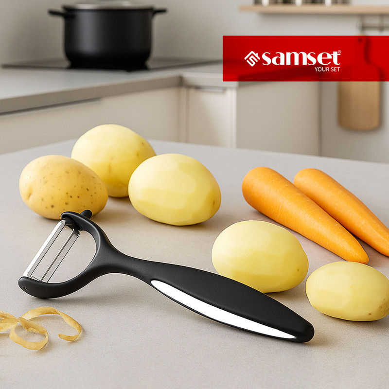 پوستکن کمانی سام ست مدل مشکی، ابزاری دستی و تیز با بدنهی آلومینیومی سبک است که برای پوستگیری آسان و دقیق انواع میوه و سبزیجات طراحی شده است