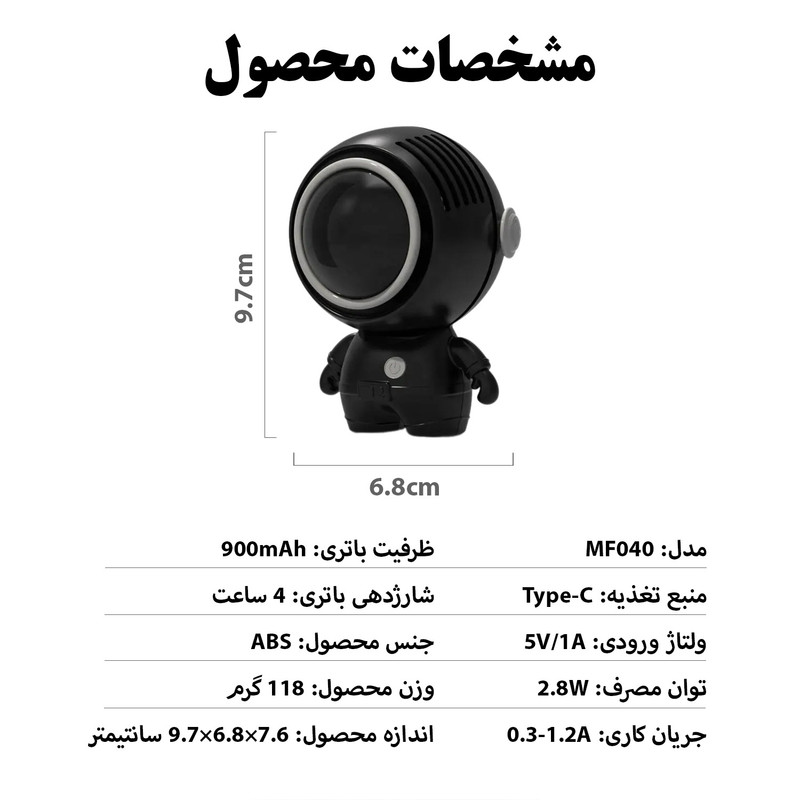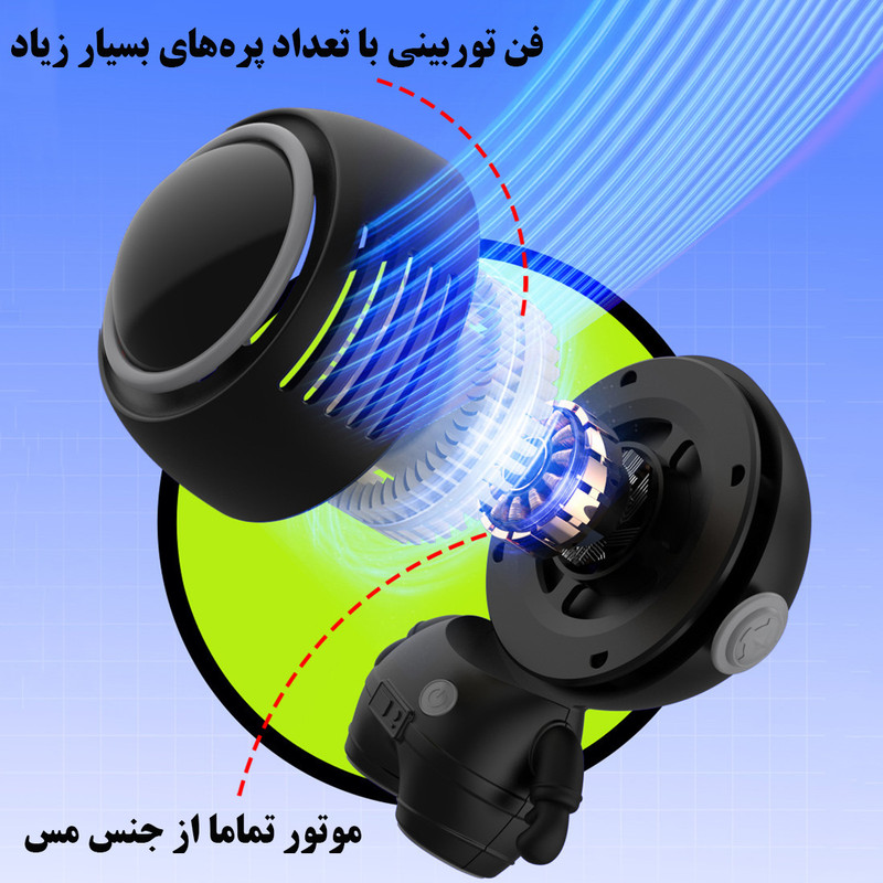 سایر مشخصات: قابلیت تنظیم زاویه باد - دارای باتری 900 میلیآمپر - دارای 3 سرعت باد - فن توربینی با 32 پره - موتور براشلس بسیار کم مصرف - دارای بند آویزی گردنی